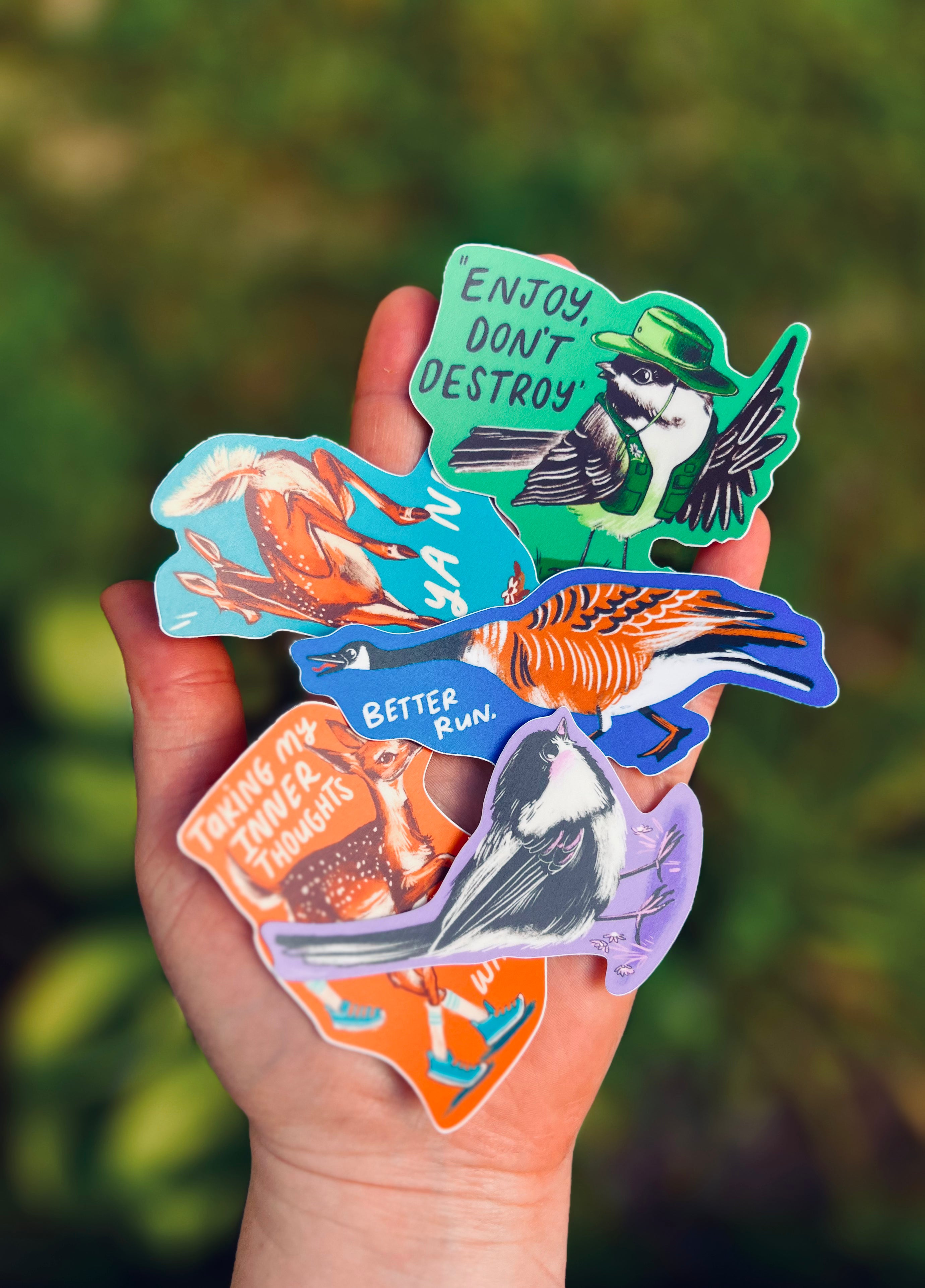 These nature inspired die-cut vinyl stickers, designed by Wild Made Goods, are perfect for your water bottle, laptop, notebook, kayak, skateboard, car, desk, igloo cooler, Thule Box, canoe-- anywhere!!